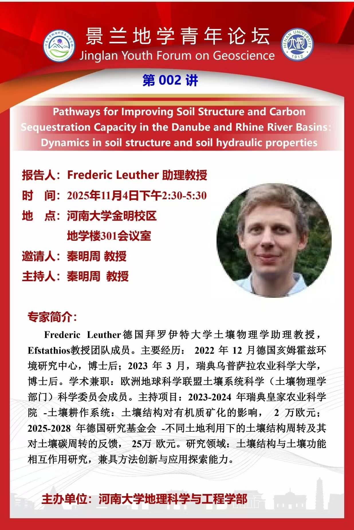 11月4日,“百年地学讲坛”第040讲与“景兰地学青年论坛”第002讲在地学楼301会议室同步开讲,会议由秦明周教授邀请并主持。本次报告会聚焦多瑙河、莱茵河流域土壤物理与水文过程、土壤结构与碳固存等前沿议题,为师生带来一场地学领域的学术盛宴。报告人从宏观流域模型到微观土壤机制的研究维度,全方位展现了地学领域在跨境流域生态治理、碳循环研究中的前沿成果,不仅深化了师生对土壤物理学、水文学交叉领域的认知,也为学部开展国际科研合作、培养复合型地学人才搭建了优质平台。未来,学部将持续通过“百年地学讲坛”“景兰地学青年论坛”等品牌学术活动,推动地学领域的跨学科交流与创新发展。