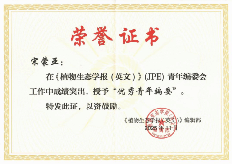 11月7日-10日,植物生态学前沿论坛暨JPE编委会会议在内蒙古呼和浩特顺利召开,我部教师宋蒙亚副教授前往参加,会议期间荣获期刊优秀青年编委称号,JPE期刊主编杨元合研究员和编委周旭辉教授为获奖者颁发荣誉证书。Journal of Plant Ecology (简称JPE),最新影响因子3.9,在生态学、林学、植物学均位列Q1区;中国科学院期刊分区表2025:大类(环境科学与生态学)一区TOP期刊。JPE连续两次获得中国科技期刊国际影响力提升计划项目资助;连续多年获得“中国最具国际影响力学术期刊”;2019和2024年,连续两次入选“中国科技期刊卓越行动计划”英文梯队期刊。