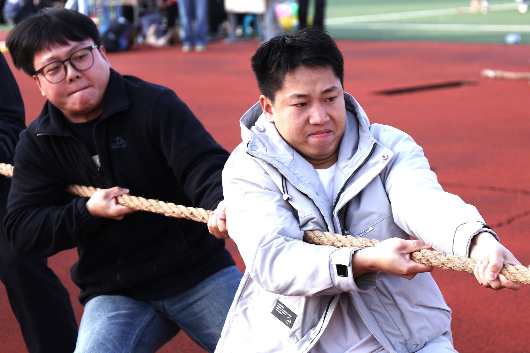 拔河赛场则精彩迭起,队员们脚下扎稳、双手紧绷,绳子在僵持中微微颤动,呐喊声此起彼伏,气氛紧张而热烈。