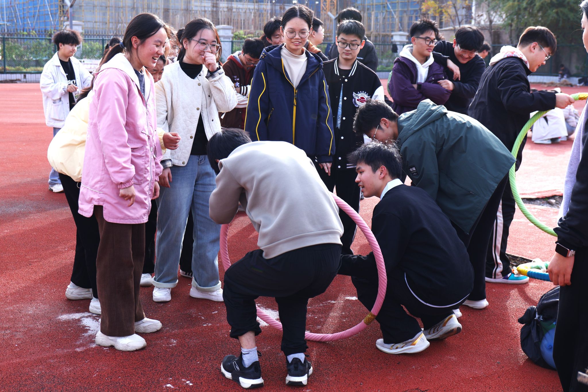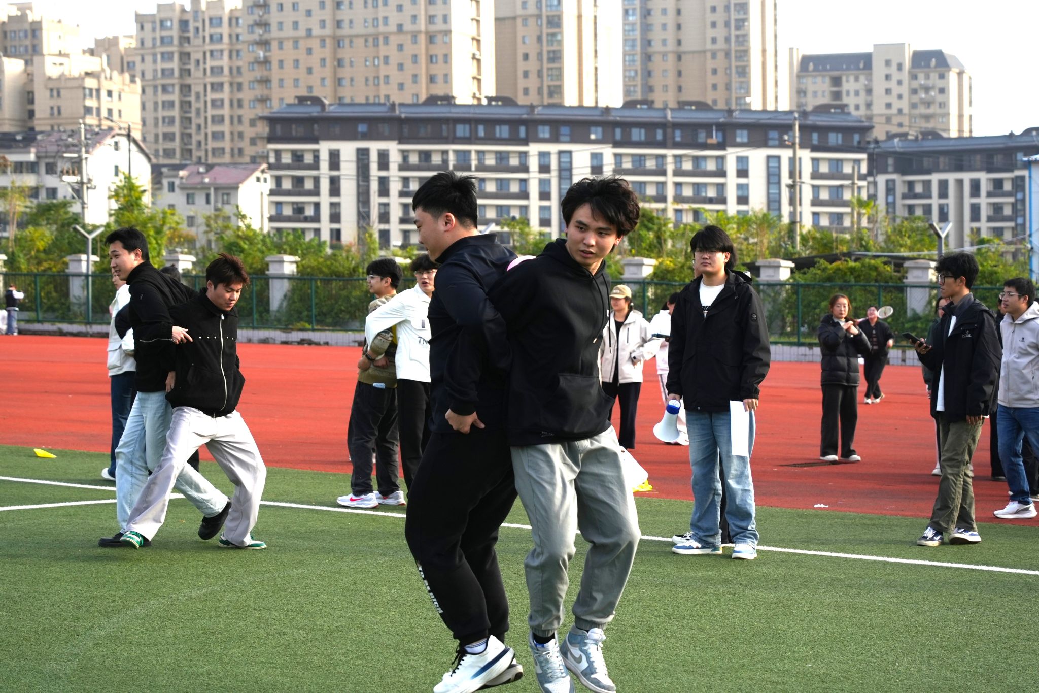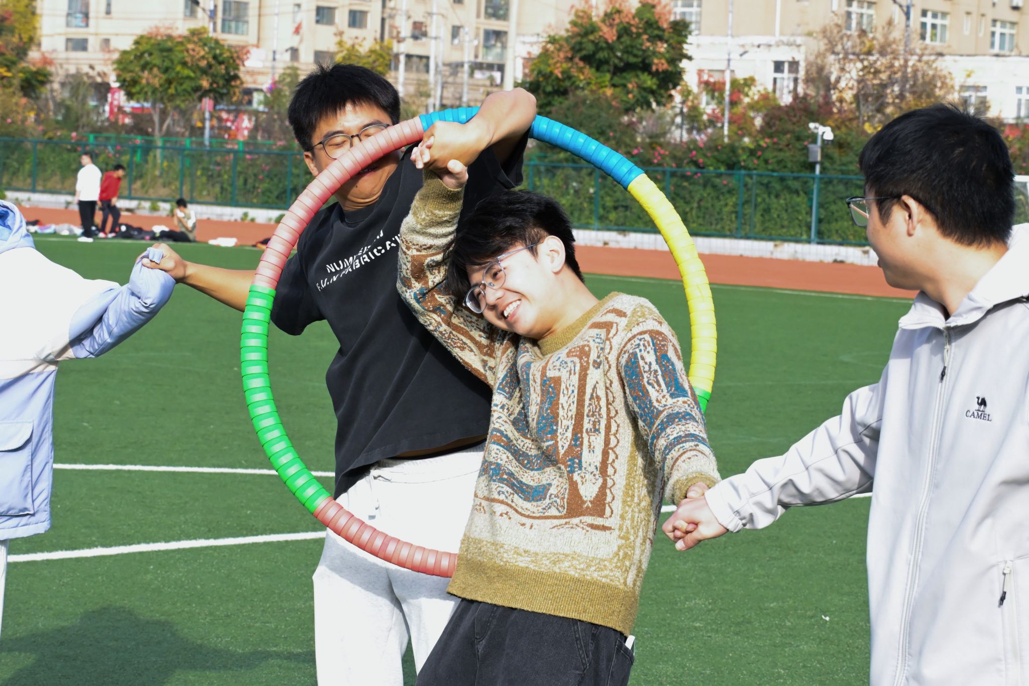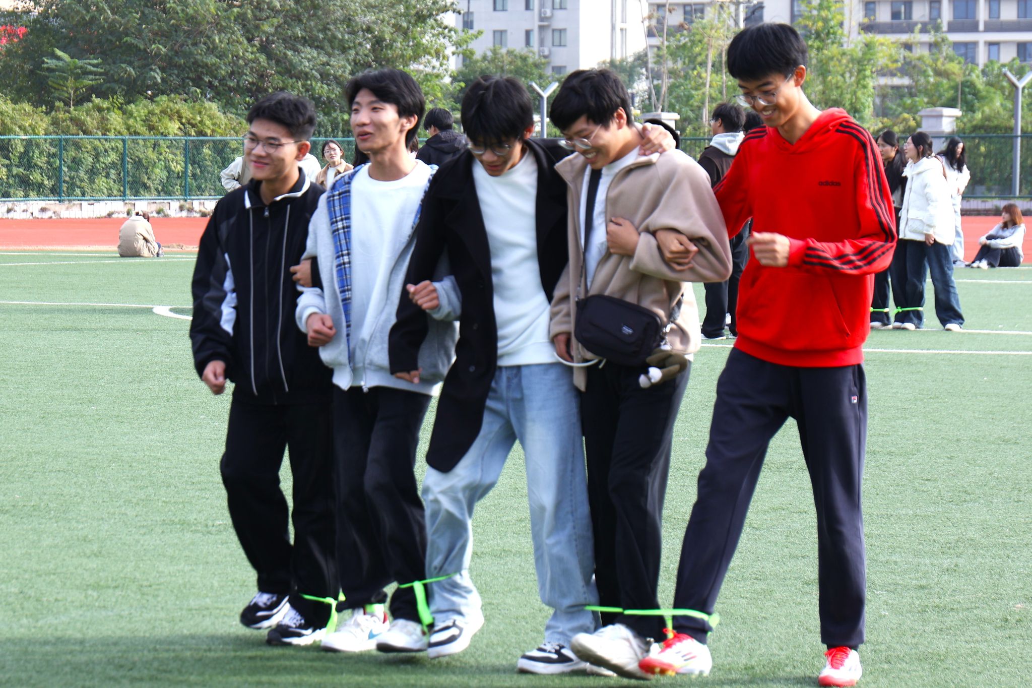 “一二一,一二一……”整齐嘹亮的口号响彻赛场,五人六足项目的同学们步调一致、稳步向前,青春的笑容在脸庞绽放,爽朗的笑声不时回荡在操场之上。