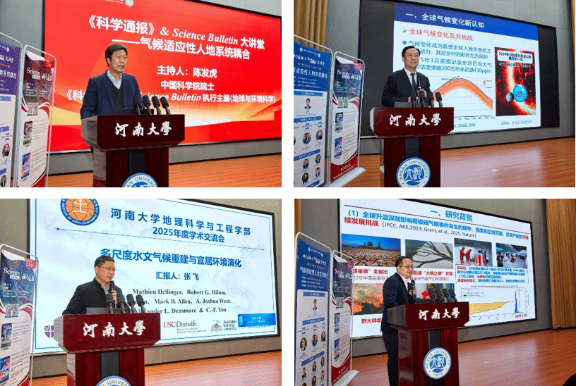 陈发虎主持《科学通报》& Science Bulletin大讲堂学术报告环节。刘彦随作题为“气候适应性乡村地域系统转型与重构”的主旨报告,从全球气候变化新认知、乡村转型与气候风险应对、气候适应型乡村系统重构三个方面展开阐述,并提出GEO-STEP新体系以应对气候变化挑战;中国科学院地球环境研究所张飞围绕“多尺度水文气候重建与宜居环境演化”主题,系统介绍了新水文指标Li同位素的研究潜力、团队已开展的相关工作、平台建设与预期成果;河南大学董冠鹏以“深度时空统计与气候变化影响探测”为题进行报告,从传统模型在刻画气候变化与经济级联效应方面的局限性出发,重点介绍了团队研发的通用多尺度时空统计建模方法、软件平台及其应用优势。三位专家的报告从不同维度呈现了人地系统耦合与气候适应性的前沿进展,引发了与会者的热烈讨论。
