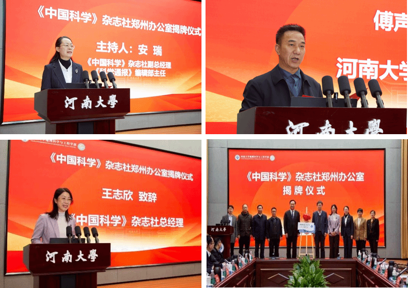 《中国科学》杂志社副总经理、《科学通报》编辑部主任安瑞主持揭牌仪式。全国政协委员、河南大别山森林生态系统国家野外科学观测研究站站长傅声雷致辞,对郑州办公室的成立表示热烈祝贺。他指出,办公室的成立将为河南大学乃至中原地区科研工作者搭建通往国际学术前沿的“直通车”,学校将以此次合作为新起点,依托办公室这一纽带,深耕学术、协同创新,共同服务国家科技创新战略,助力中原地区高质量发展与“双一流”建设。