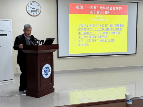 张占仓研究员介绍了习近平总书记对“十五五”规划的高度重视并全面阐释党中央对“十五五”规划提出的总体要求。他指出,“十五五”时期将以习近平新时代中国特色社会主义思想为根本遵循,统筹推进“五位一体”总体布局、“四个全面”战略布局和六项原则贯穿发展全过程,全面服务中国式现代化建设。主要目标聚焦“两个大提升”,科技自立自强要取得重大突破,经济实力与国际影响力要实现显著跃升,为2035年基本实现社会主义现代化奠定坚实基础。张占仓研究员系统分析未来五年GDP增长预期与经济动能,从必要性与可行性两个方面展开深入阐述:在必要性方面,保持一定增速对提升综合国力、扩大就业、改善民生具有基础性作用;在可行性方面,科技创新、新能源、新材料、新兴产业壮大等为经济持续增长提供了坚实动力,深度学习模型、新能源汽车等产业的快速崛起展现出新质生产力的蓬勃活力。围绕党中央提出的“高质量发展”这一主线,张占仓研究员从科技创新引领新质生产力发展、构建现代化产业体系、建设强大国内市场、扩大高水平对外开放、推动农业农村现代化与绿色转型五个维度展开分析。