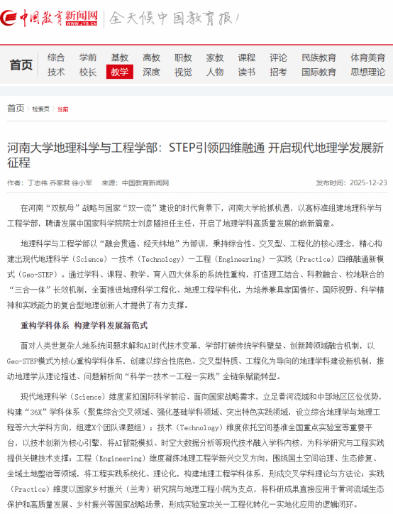 在河南“双航母”战略与国家“双一流”建设的时代背景下,河南大学审时度势、抢抓机遇,以高标准组建地理科学与工程学部,聘请发展中国家科学院院士刘彦随担任主任,开启了地理学科高质量发展的崭新篇章。近年来,学部以“融会贯通、经天纬地”为部训,秉持综合性、交叉型、工程化的核心理念,精心构建出现代地理科学(Science)-技术(Technology)-工程(Engineering)-实践(Practice)四维融通新模式(Geo-STEP)。通过学科、课程、教学、育人四大体系的系统性重构,打造理工结合、科教融合、校地联合的“三合一体”长效机制,全面推进地理科学工程化、地理工程学科化取得显著成效,为培养服务兼具家国情怀、国际视野、科学精神和实践能力的复合型地理创新人才提供了有力支撑。
