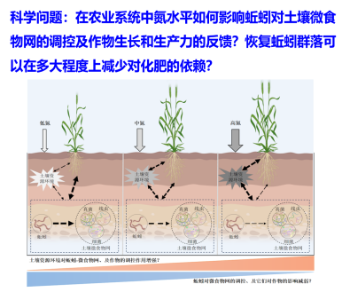 邵元虎做了题为“蚯蚓在玉米-小麦轮作体系中的减氮增产效应及其土壤微食物网调控机制”的专题报告。该研究聚焦“氮肥水平如何影响蚯蚓调控土壤微食物网及作物响应”这一关键科学问题,通过控制试验揭示了在玉米-小麦轮作体系中,合理利用蚯蚓可在减少氮肥施用30%的条件下,维持粮食产量。而可能的机理是蚯蚓在合理减氮条件下可通过激活有益线虫、抑制病原线虫、增强土壤微食物网内生物网络互作等途径,显著提升作物产量与氮肥利用效率。该工作创新性阐明了蚯蚓生物调控效应与氮输入水平的耦合关系,为华北地区农业系统减氮稳产、推动绿色转型提供了重要机理依据,也为国家“藏粮于地、藏粮于技”与农业可持续发展战略提供了科学与实践支撑。