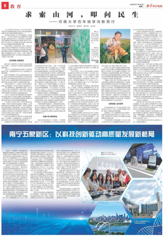 11月18日,《新华每日电讯》刊发报道《求索山河,叩问民生——河南大学百年地学向新而行》。报道指出,百年峥嵘岁月中,一代代河大地学人紧扣地理学科严谨规律、深度融入国家发展大局,以“求真务实、开拓创新”的科学精神与“融会贯通、经天纬地”的实干作风,践行“读万卷书,行万里路,谋万民福”的地学理念,已然成长为全国地理学领域的重要力量。“承百年薪火,开学科新局。”如今,河南大学组建起国际首个地理科学与工程学部,秉持综合性、交叉性与工程化发展理念,打破传统学科壁垒、融合重构学科体系,推动地理学实现从现象描述、问题解析、机理解释向“科学—技术—工程—实践”四维融通的新模式转型,为培养复合型地理创新人才筑牢了坚实支撑。