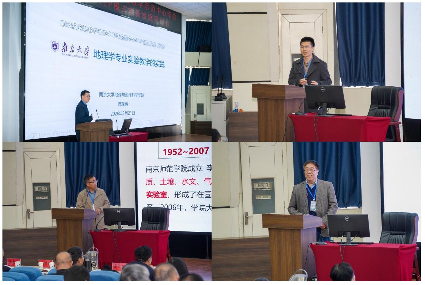 乔家君主持国家级实验教学示范中心交流会,来自全国多所顶尖高校的专家学者分享了示范中心建设的建设成效与特色作法。鹿化煜分享了南京大学地理学专业实验教学的深耕实践与体系化建设经验;艾明耀系统介绍了武汉大学遥感数智实验中心建设与人才培养的丰硕成果;李红波分享了南京师范大学地理科学示范中心十八载深耕、三代迭代的跃迁发展历程;郑新奇带来了中国地质大学(北京)地学虚拟仿真实验教学“五定五化”的一流课程实践探索;乔家君全面介绍了我校环境与规划国家级实验教学示范中心在实践教学改革和Geo-STEP模式应用方面的举措。
