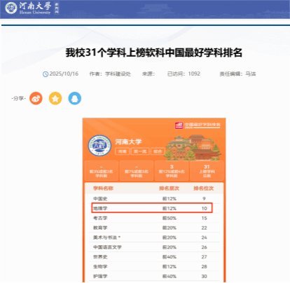 近日,高等教育评价专业机构软科正式发布“2025软科中国最好学科排名”,我校共有31个学科上榜。其中,地理学学科位列全国前12%,成功进入“中国一流学科”行列。下一步,学部将聚焦优势资源,打造地理学科群,形成学科“冲锋”的强劲合力;加快优化学科专业布局,迭代更新人才培养模式,持续加大高层次人才引育力度;深入推进有组织科研,以建制化攻关实现学科整体实力显著提升与关键领域突破。