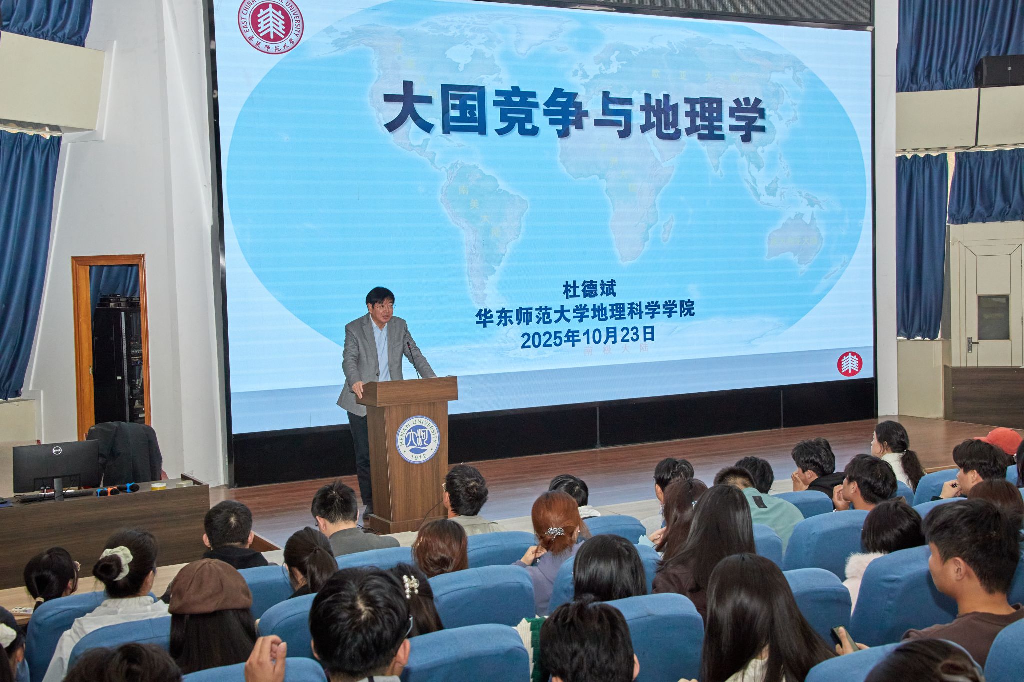 讲座伊始,丁志伟对杜德斌教授进行了简要介绍,并代表地理科学与工程学部对他的到来表示热烈的欢迎。报告以“大国竞争与地理学”为主题,紧密围绕当前国际格局的深刻变革展开,系统剖析了现代地理学与大国竞争的历史渊源,从世界进入新的大国竞争时代、现代地理学起源于大国竞争、地理科学理论服务大国竞争、新时代中国地理学的使命等四个方面进行了详细阐述。在理论重构方面,他指出新时代中国地理学需要超越传统地缘理论中的零和博弈逻辑,将“生存空间”的竞争思维转化为“共生空间”的合作理念,将“心脏地带”拓展为生态与发展的地理枢纽,为全球治理提供指引。在学科创新方面,他指出要深化世界地理学科建设,打造“中国发展全球变局”交叉融合课程与动态教材体系;依托“一带一路”实践平台,开展地缘政治分析、跨国项目模拟等实战教学,着力培养兼具地理空间智能、国际政经洞察力与战略决策能力的复合型创新人才。在范式转型方面,他指出要聚焦大国博弈关键区、“一带一路”区域,深化区域国别研究,推动研究范式从静态描述“区域差异”转向动态追踪“区际联系”,挖掘不同地区在全球网络中的共生价值为跨区域合作和治理提供学理依据。在强化地理学现实作用方面,他引用胡焕庸先生的“地理学研究既要用‘显微镜’,横察中国现世;更须用‘望远镜’,纵观世界大势”和《世界地理大会宣言》的“面对百年未有之大变局,中国地理学人肩负新的历史使命,应树立更加宽广的世界眼光,赶上时代,引领时代”等内容,认为中国地理学不仅要为国家的全球战略与安全提供智力支撑,更要为构建人类命运共同体贡献学科力量。报告最后,杜德斌分享了国内在世界地理与区域国别研究领域的前沿进展,展示了已上线的全球创新研究网站,提出了全球创新策源地图平台的研究思路与应用前景。