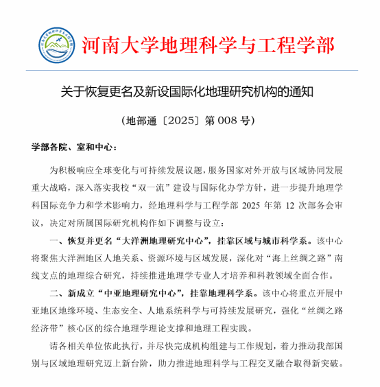 大洋洲地理研究中心的前身是1981年成立的河南大学大洋洲研究室,为服务国家“一带一路”战略需要,2017年更名为“河南大学澳洲研究中心”。两大中心的揭牌成立,可有效推进从区域地理研究到国际平台智库服务的深度跨越,更好地构建“立足中原、面向全国、走向世界”的地理学部建设与学科发展新格局。据悉,两大中心以地理学为基础,未来将聚焦人地系统科学与可持续发展、综合地理学与地理工程、资源环境保护与区域创新、地缘关系与生态安全等领域研究,创建国际合作、科学攻关、人才培养与交流的长效机制,融合多学科力量在服务国家“一带一路”“海洋强国”战略中精准发力,持续提升地理学科的国际话语权与影响力,为国家高水平对外开放和人才引智创新工程提供智力支撑,在服务国家战略与学术前沿探索中持续贡献“河大地理力量”。