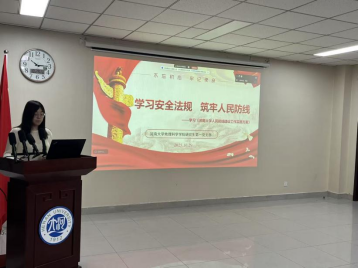 为深入普及国家安全相关知识,切实增强广大党员的国家安全意识和法治观念,10月29日,研究生第一党支部在地学楼二楼报告厅开展以“学习安全法规,筑牢人民防线”为主题的党日活动。本次活动由党支部书记卞荷雨主持,由党员邢运龙进行领学,全体党员和部分入党积极分子参加。