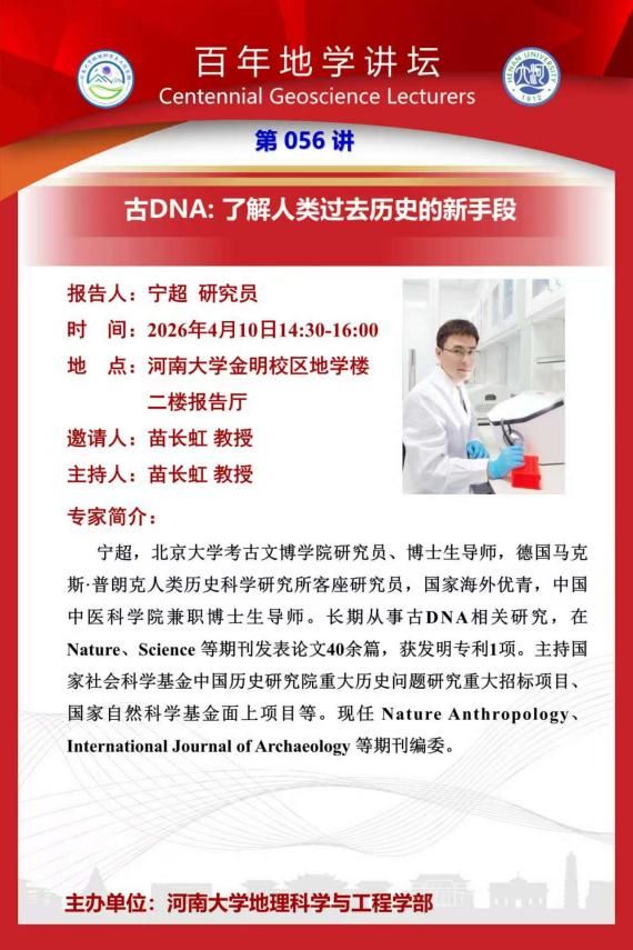 4月10日上午14:30-16:00,由学部主办的“百年地学讲坛”第056讲在我校金明校区地学楼二楼报告厅举行。本次讲座主题为“古DNA: 了解人类过去历史的新手段”,由北京大学考古文博学院研究员、博士生导师,德国马克斯·普朗克人类历史科学研究所客座研究员,国家海外优青,中国中医科学院兼职博士生导师宁超主讲,苗长虹教授邀请并主持。