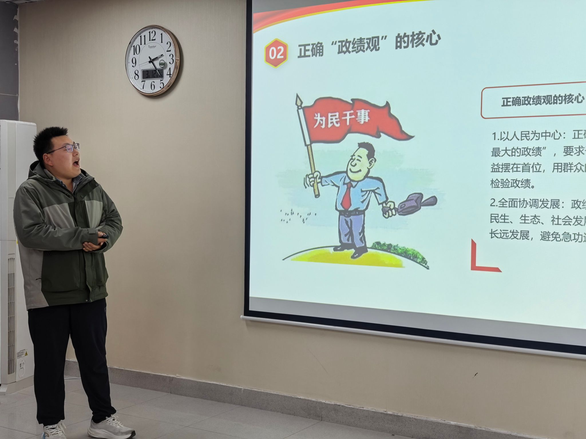 活动首先进行专题领学。支部组织委员吴文雨围绕“何为政绩观”“正确政绩观的核心要义”以及“习近平总书记的实践典范”等内容,对正确政绩观的科学内涵进行了系统解读。他结合习近平总书记在地方工作期间的实践案例,深入阐释了以人民为中心的政绩导向,强调在青年干部政绩观培育中要坚持理论武装与实践锻炼相结合,引导党员进一步明确干事创业的价值坐标与行为准则。