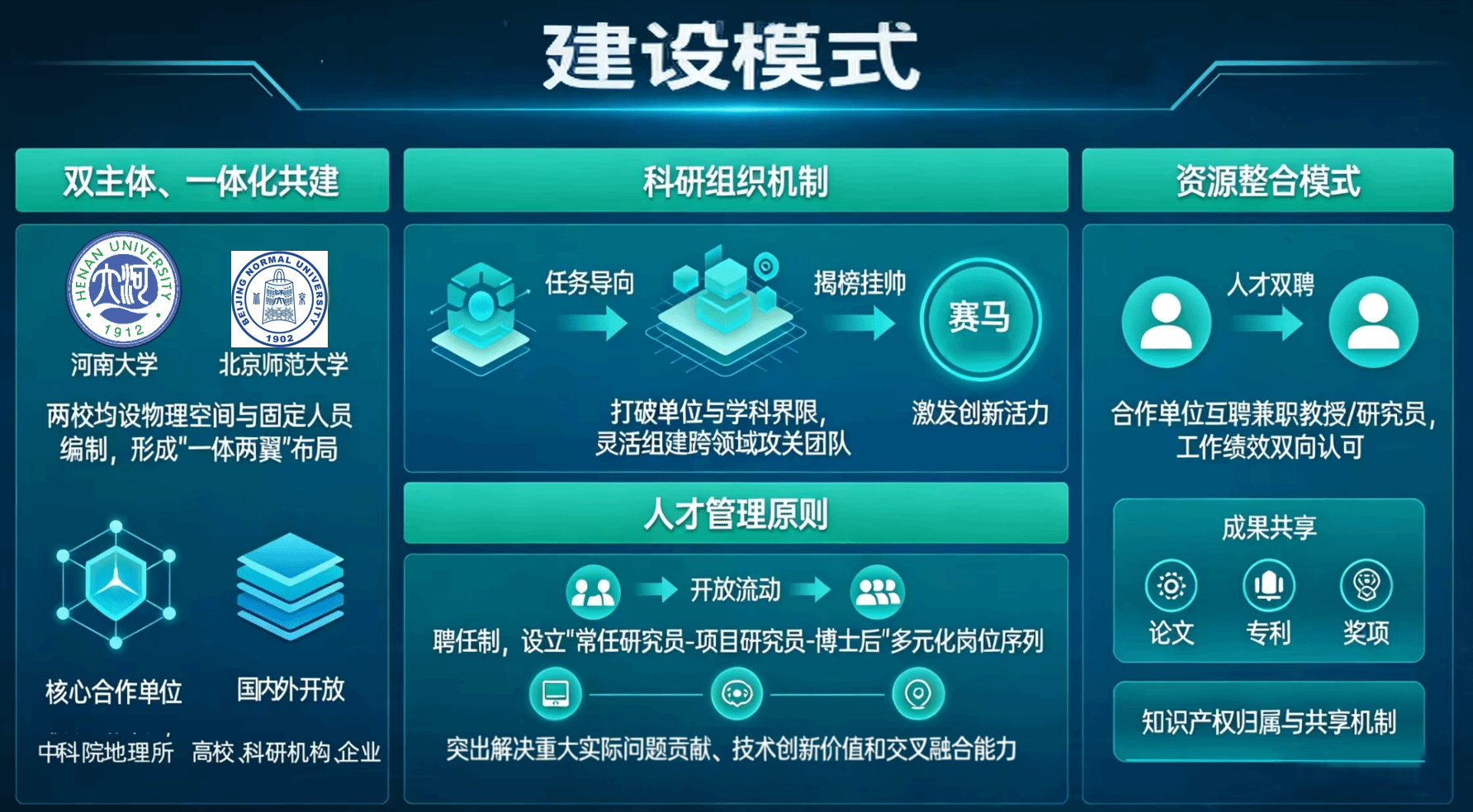 研究院采用双主体、一体化共建模式,河南大学与北京师范大学作为双主体共同投入核心资源,在两校均设物理空间与固定人员编制,形成“一体两翼” 布局,同时吸纳中国科学院地理科学与资源研究所为核心合作单位,面向国内外高校、科研机构和企业保持开放;科研组织上实行任务导向、动态组合,以国家重大需求和科研任务为核心,打破单位与学科界限,灵活组建跨领域攻关团队,推行“揭榜挂帅”“赛马”等机制激发创新活力;资源整合方面建立人才双聘、成果共享模式,合作单位互聘核心研究人员为兼职教授/研究员,工作绩效双向认可,同时明确论文、专利、奖项等科研成果的知识产权归属与共享机制,保障各方权益;人才管理上遵循开放流动、分类评价原则,实行聘任制并设立“常任研究员-项目研究员-博士后”多元化岗位序列,探索区别于传统学科的职称评定与人才评价体系,突出解决重大实际问题的贡献、技术创新价值和交叉融合能力,打造一支兼具家国情怀、全球视野的高水平科研梯队。