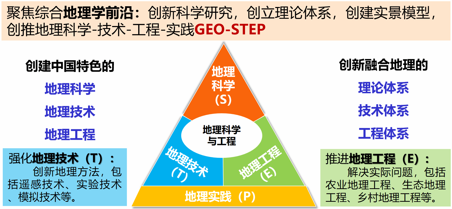 (1)科研创新平台体系建设:人地系统耦合模拟中心、地理工程技术研发中心、国土空间智能模拟实验室、数据与知识中心。研发人地系统耦合模拟器,研制一系列适用于生态修复与空间优化的地理工程关键技术包与标准体系,开发国土规划智能决策平台,建设开放共享的“人地系统科学大数据平台”,构建“人地系统科学案例库”与“地理工程图谱”,促进数据与知识的沉淀、共享与复用。